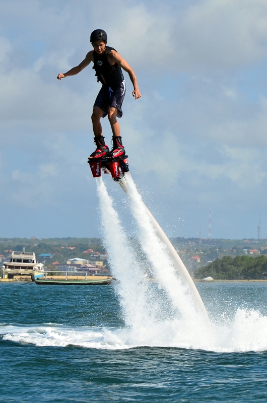 Perangkat flyboarding mirip JetLev yang juga bisa membuat penggunanya terbang di atas permukaan air. Perbedaannya, JetLev dipanggul di punggung seperti tas ransel, sementara flyboard dipasangkan pada kaki pengguna sehingga dapat bergerak lebih fleksibel. Semua peralatan flyboarding di TheWhacko Beach Club sudah berstandar internasional dengan operator yang berpengalaman. Sebelum memulai olahraga baru yang seru ini, peserta dibawa terlebih dahulu ke sebuah pontoon di tengah laut untuk diberikan pelatihan singkat, termasuk trik untuk berdiri seimbang dan menjaga keselamatan diri. Berhubung risiko saat bermain cukup tinggi, peserta juga harus untuk menggunakan jaket pelampung dan helm.