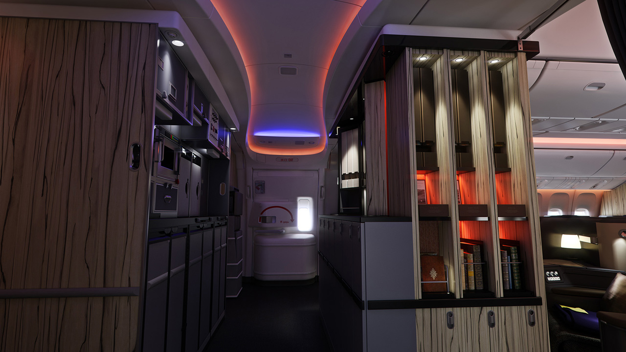 Selain itu, Boeing 777-300ER ini juga dilengkapi dengan Sky Lounge yang bergaya modern dan nyaman.